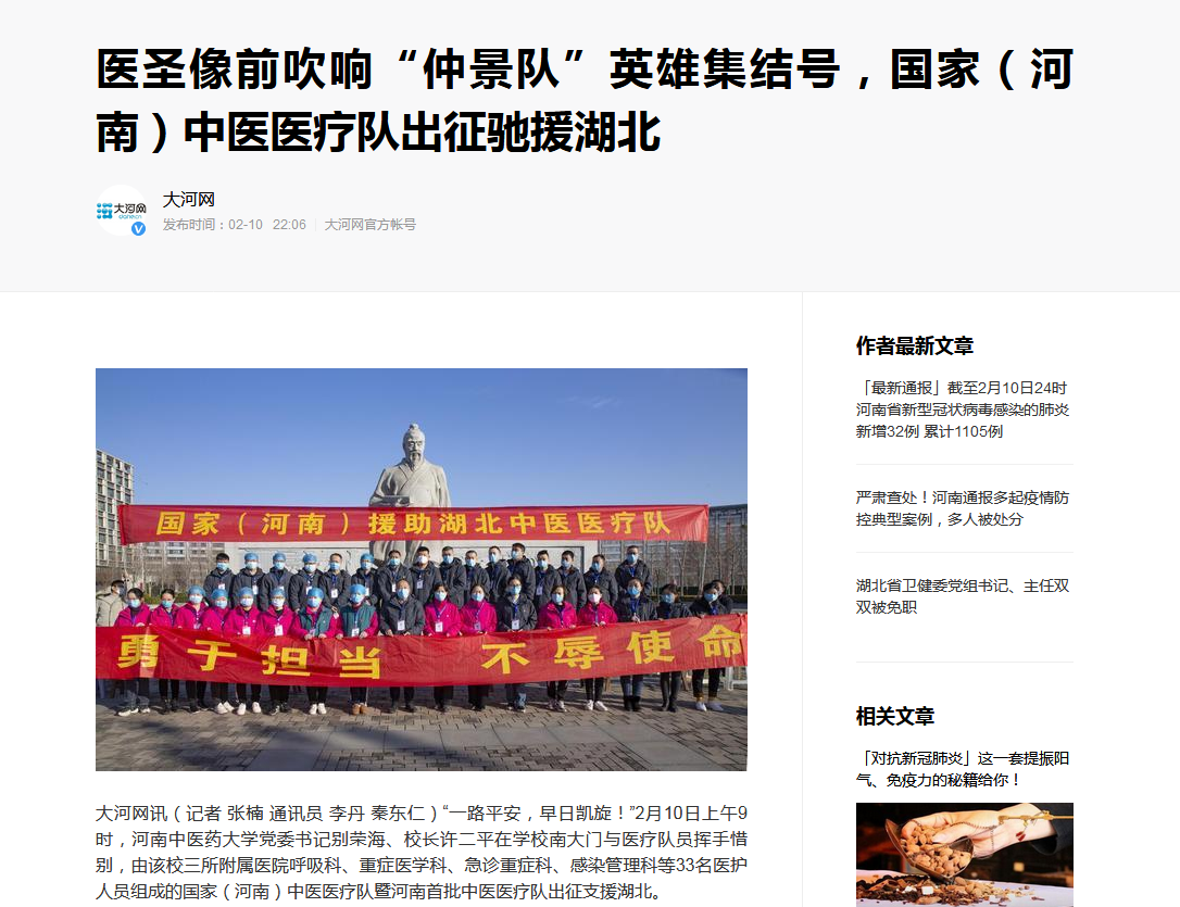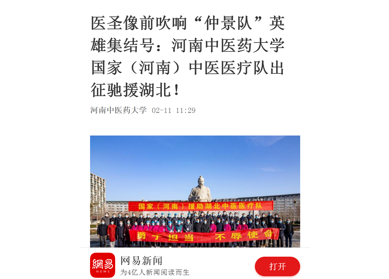 编者按:2020年2月10日-11日,大河网、网易新闻对我校援助武汉国家(河南)中医医疗队启程进行报道。现将网易新闻全文刊发如下: