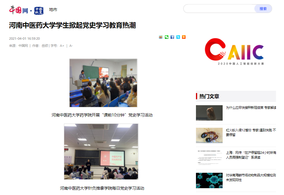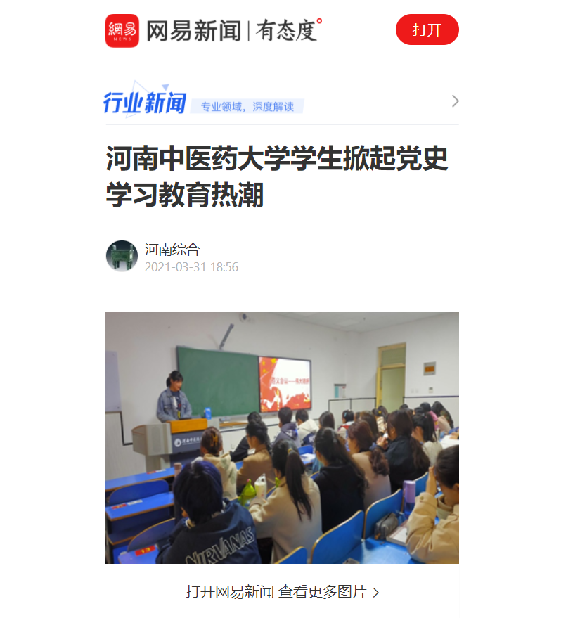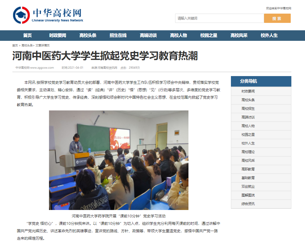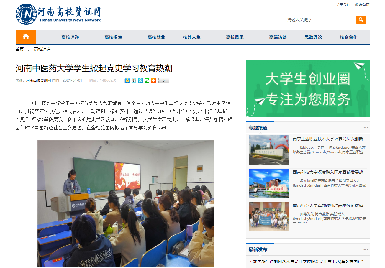 编者按:2021年4月1日,中国网、中华高校网、大河网、河南高校资讯网、网易新闻、新浪新闻等多家媒体对我校学生掀起党史学习教育热潮进行广泛报道。现将全文刊发如下: