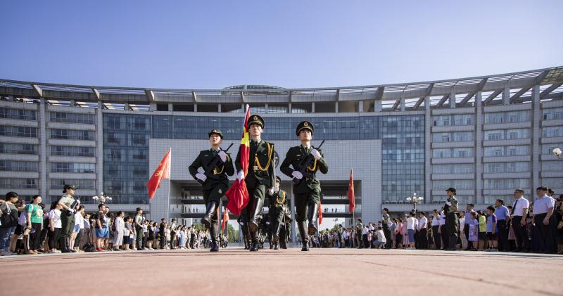 国旗护卫队队员迈着整齐的步伐,护送五星红旗入场。在气势磅礴的国歌声中,五星红旗冉冉升起,现场师生行注目礼。随后,擎旗手托举党旗入场,在领誓人、校党委组织部副部长马赟的领读下,新党员列队面向党旗进行庄严的入党宣誓,现场老党员一起重温了入党誓词。