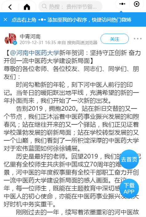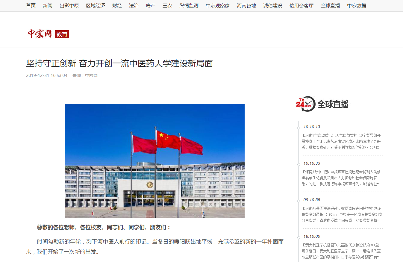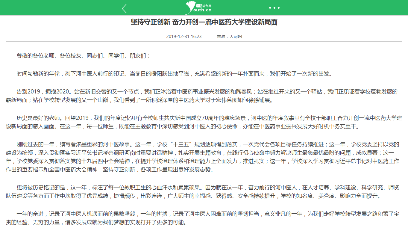 编者按:2019年12月31日,中青网、中宏网、大河网、中青河南官网微博对我校新年贺词进行报道。现将全文刊发如下:
