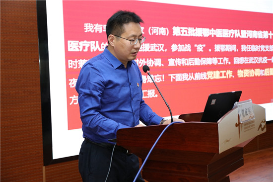 一天88个电话(不包括微信),在前一天凌晨2点多休息的情况下,接下来一天早8点开始的26个小时内,只休息了不到5个小时,这就是在江夏方舱医院开舱初期,58岁的郑福增副院长的工作强度。在报告会上,他从医疗队筹建、出征准备、江夏方舱医院架构搭建、制度制定落实、确诊患者救治等方面,为大家分享了他的援鄂经历。他说,最难忘的事是中医方舱的设计者张伯礼院士对大家的激励,最感动的事是年轻队员在这次疫情防控阻击战中的担当和成长,最大的体会是中医抗击新冠肺炎有药可用、确实有效、可加速康复。他总结了团队的几个优势。一是医院党委为医疗队配备了随队感控专家,为确保医务人员零感染提供了保障;二是团队中的耳鼻喉科专家,在方舱内开展的咽拭子检测对比研究、院内制剂“清肺排痰滴剂”救治病人,为提高检测的准确性、病人救治成功率做出了很大的贡献;三是在派遣第五批国家(河南)中医医疗队时,注重选派中医博士进舱开展科研观察,科研数据收集的完整性得到了张伯礼院士的肯定;四是随队的后勤保障人员出色的工作确保了医护人员的营养和工作生活便利,为保障医护人员“零感染”做出了重要贡献。他表示,大疫无情,大爱无疆,国家危难之时,医务工作者就应该响应党的号召,挺身而出。3月10日作为代表参加习近平总书记召开的视频会议,他更深切地感受到了祖国向世界贡献中国力量、中国智慧、中国方案的自豪。