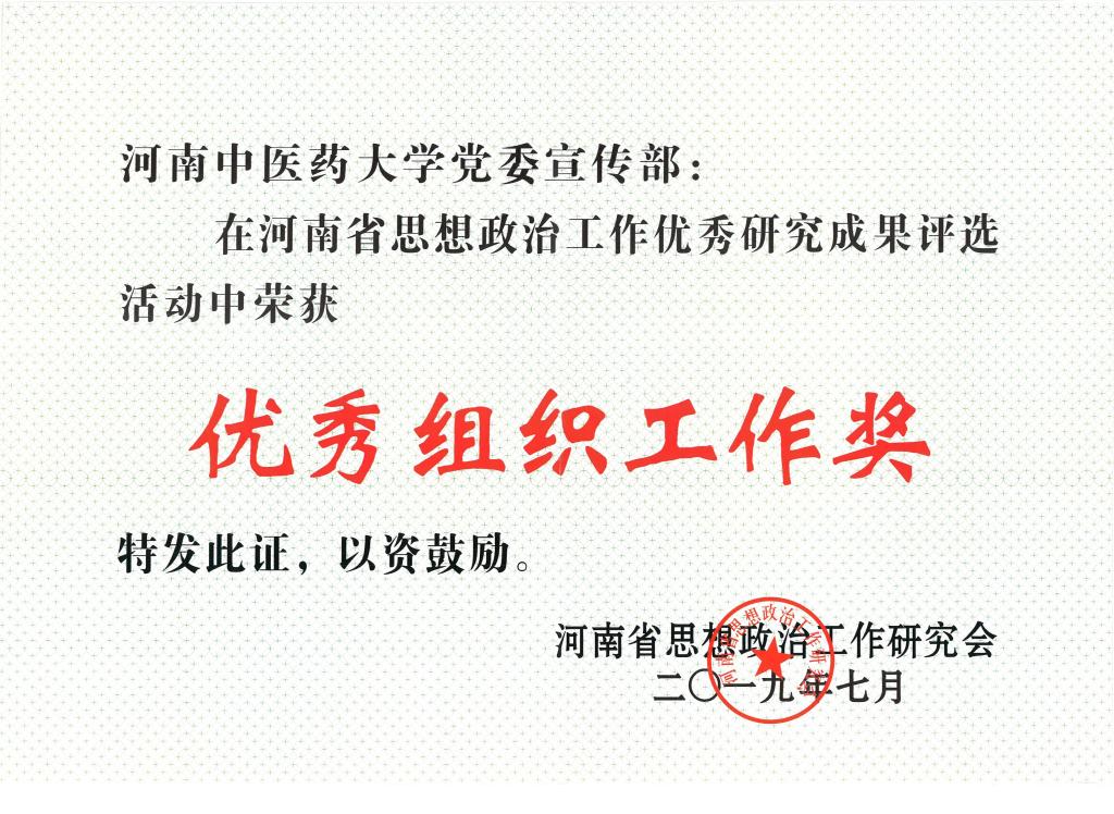 与相关部门通力合作,开展2019年度校级“课程思政”示范课程、重点培育课程遴选工作和院级“课程思政”立项工作,共立项21项,资助26万元,课程思政覆盖面达到20%。荣获河南省思想政治工作研究成果优秀组织工作奖,5项成果分获河南省思想政治工作优秀研究成果一、二、三等奖。