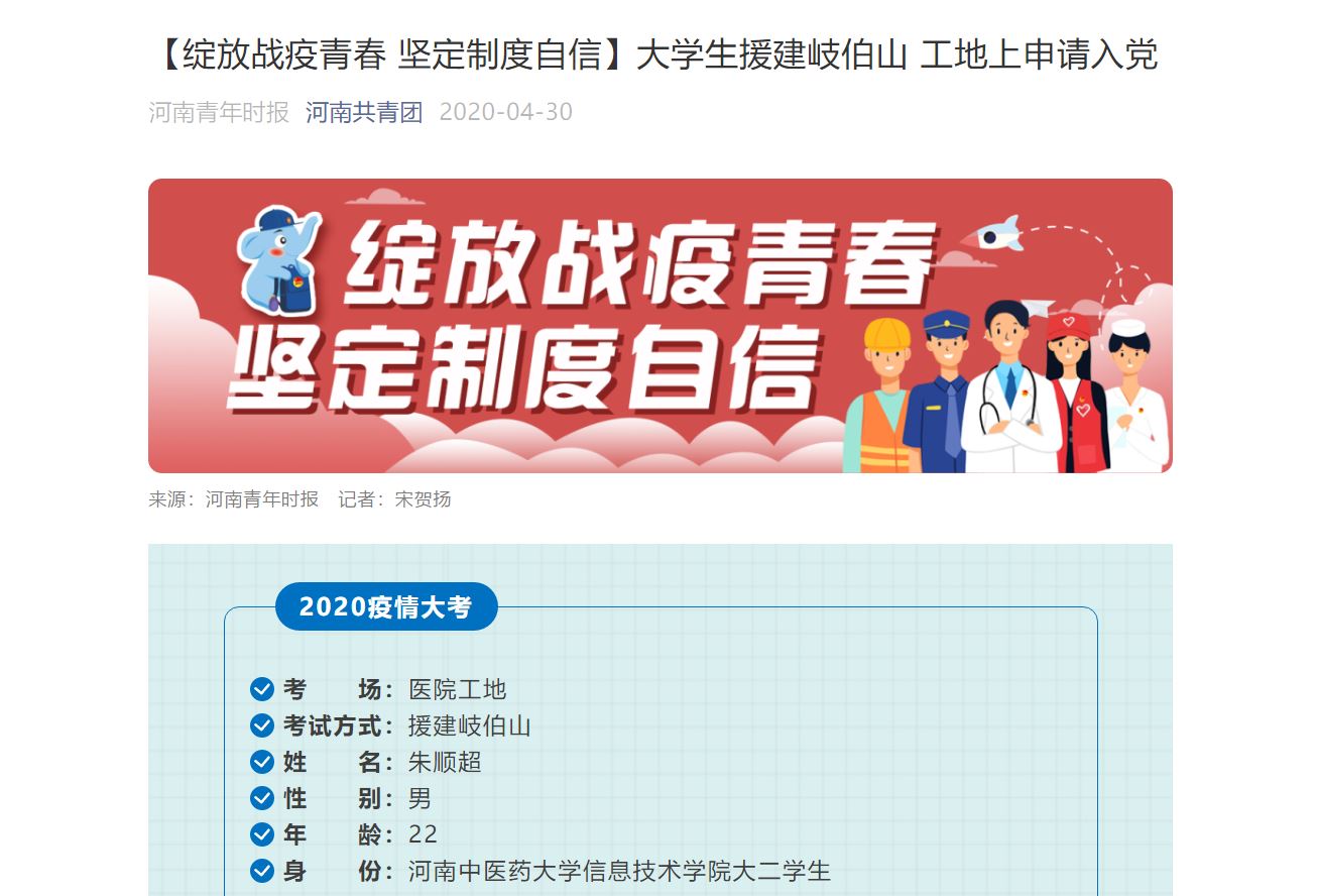 编者按:2020年4月30日,河南共青团官方微信对我校信息技术学院2018级学子朱顺超援建岐伯山医院,在施工现场申请入党进行报道。现将全文刊发如下:
