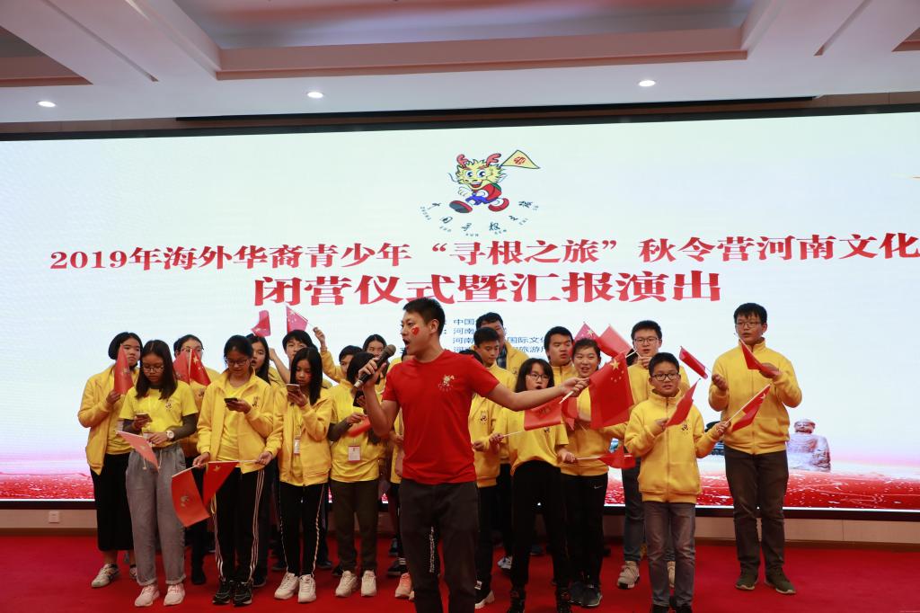 本网讯(文/李敬平 图/付晓)2019年海外华裔青少年“寻根之旅”秋令营河南文化营闭营仪式暨汇报演出日前在我校举行。此次活动由中国侨联主办,河南省侨联、河南省华侨国际文化艺术交流协会承办。我校与郑州大学作为协办单位,在10天活动中为来自德国、泰国、澳大利亚、新西兰等国家和地区的近百名海外华裔青少年团员提供了一场丰富多彩的文化盛宴。河南省侨联党组书记、主席董锦燕,河南省文化和旅游厅、我校相关负责同志参加了闭营仪式。