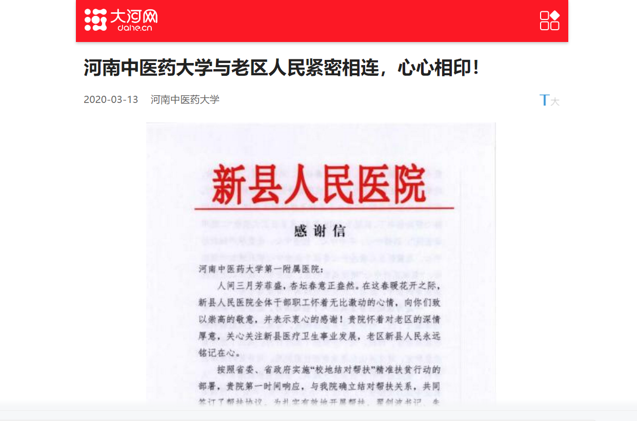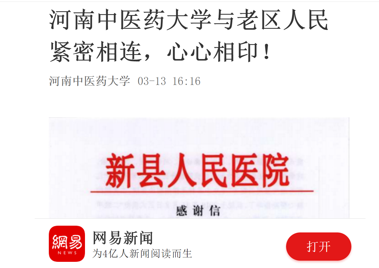 2020年3月13日,大河网、网易新闻对新县人民医院致我校的感谢信进行报道。
