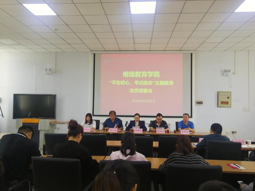 2019年9月20日上午,继续教育学院在图书馆四楼多媒体教室召开了“不忘初心、牢记使命”主题教育动员部署会议。学校“不忘初心、牢记使命”主题教育第五指导组成员马慧玲到会指导。继续教育学院领导班子成员及全体教职工参加会议。会议由院长翟立武主持。