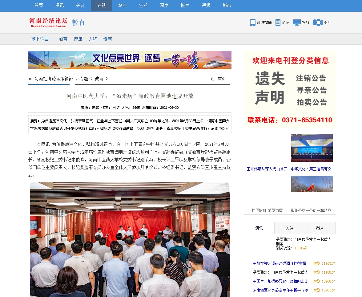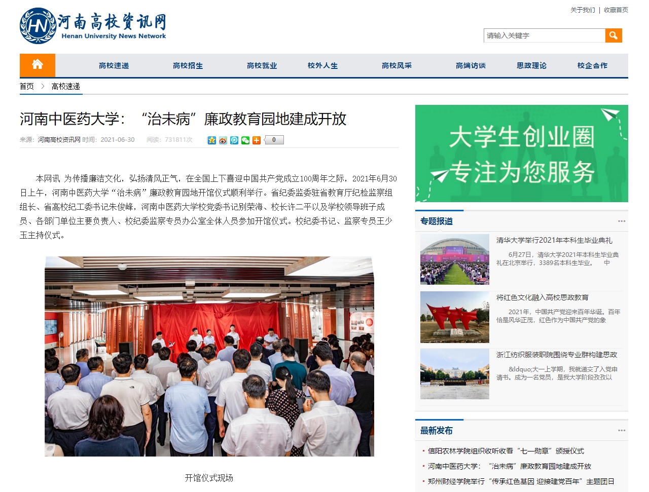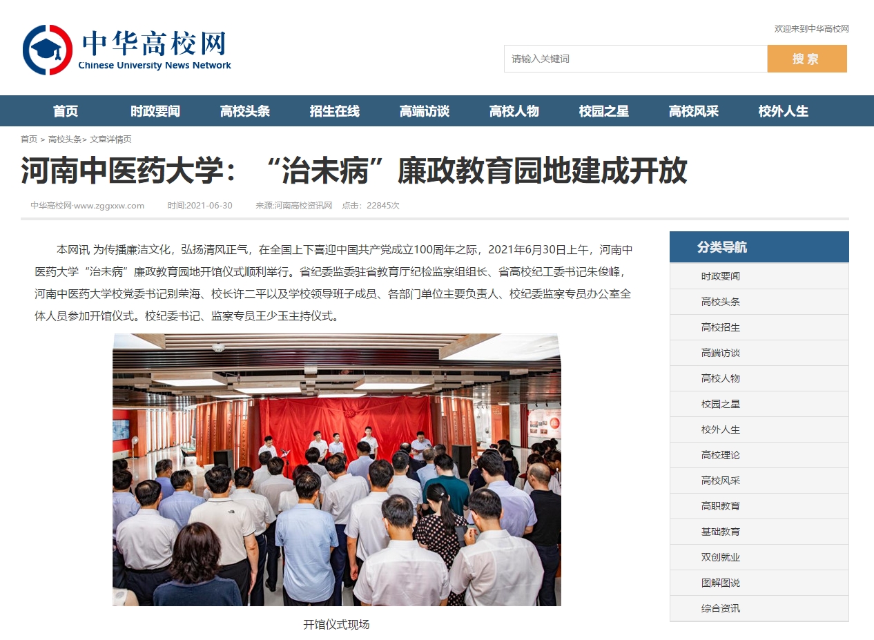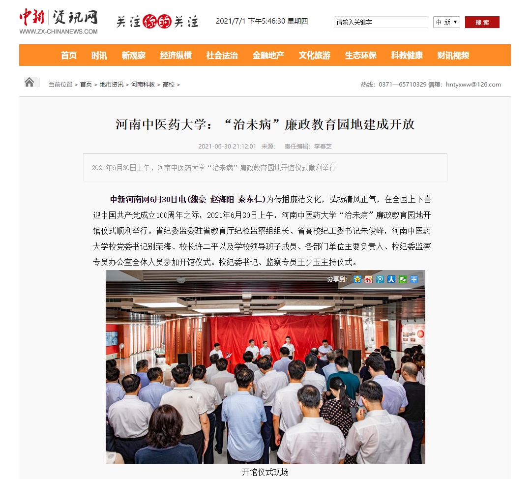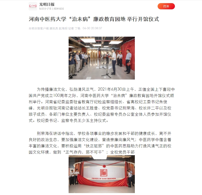 编者按:2021年6月30日,光明日报客户端、中新资讯网、中华高校网、河南高校资讯网、新豫网、河南经济论坛对我校“治未病”廉政教育园地开馆仪式进行报道。