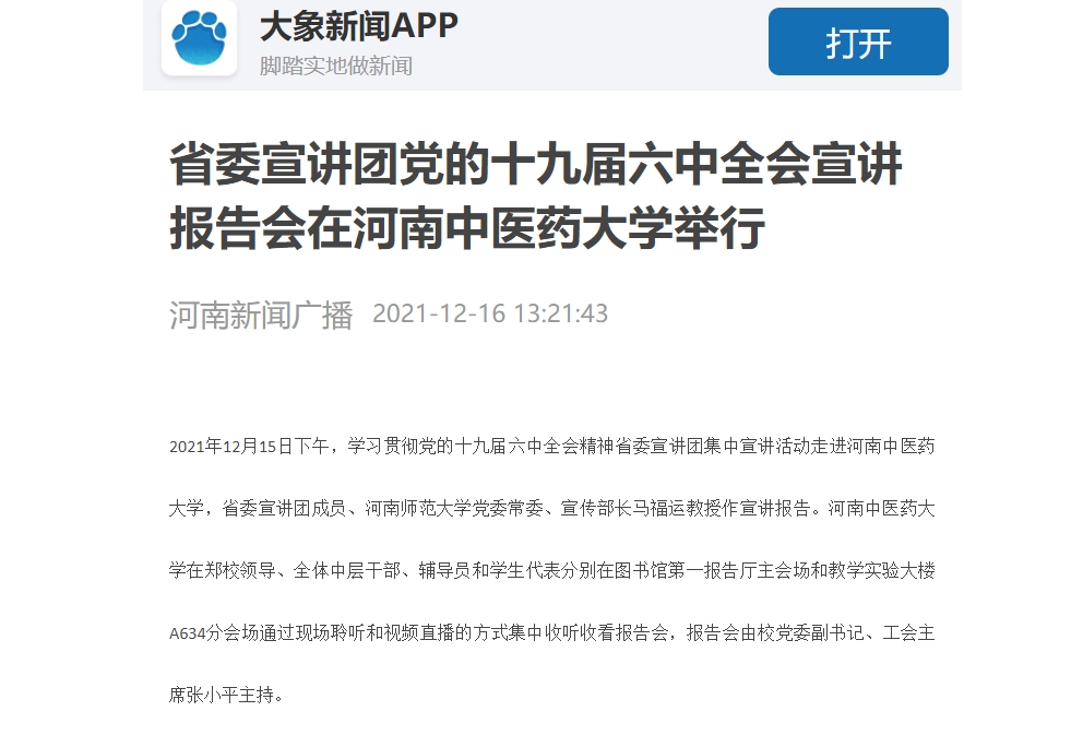 2021年12月14日-15日,河南新闻广播对省委宣讲团党的十九届六中全会宣讲报告会在我校举行进行报道。