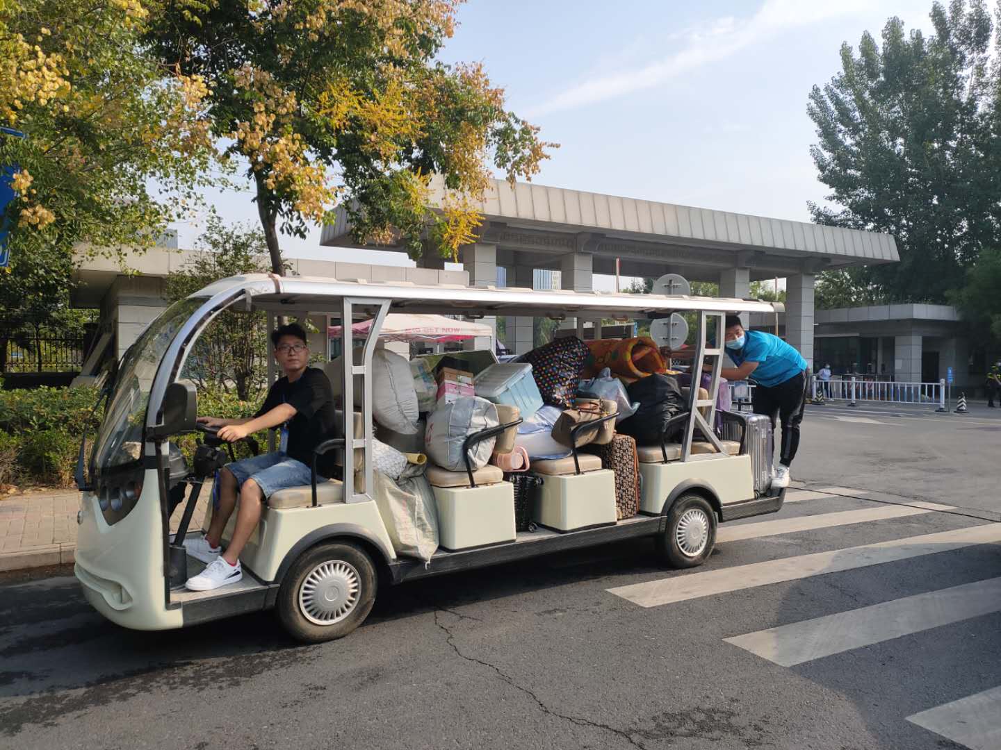 在龙子湖校区报到现场,研究生新生按照疫情防控要求,自学校北门进行扫码登记、行李消毒、体温测量后进入校园。迎新志愿者服务贴心周到,专车负责将行李运送至宿舍,并耐心细致为新同学答疑解惑。