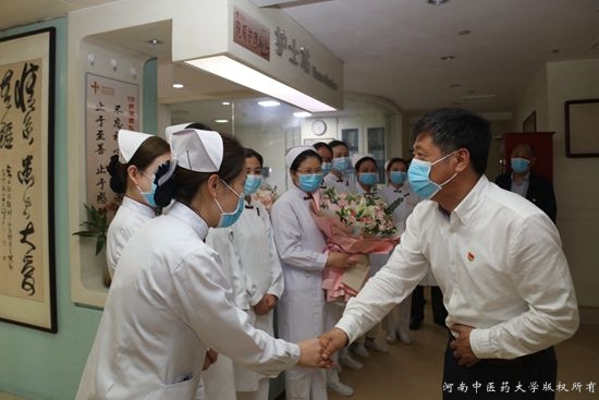 本网讯(文/张琰 图/王东方)2021年5月10日下午,在第110个国际护士节来临之际,校长许二平、校长办公室主任陈相新、工会副主席刘延江等一行到二附院亲切慰问正在辛勤工作的白衣天使,向临床一线的广大护理工作者和护理学院全体师生致以节日的问候。二附院党委书记王海亮、院长崔应麟、副院长张勤生、工会主席李希民等一同慰问。
