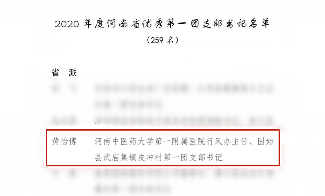 本网讯(文图/何世桢)近日,河南省“第一团支书”工作领导小组下发文件,公布2020年度河南省优秀第一团支部书记名单,一附院黄怡博同志荣获“河南省优秀第一团支部书记”称号。