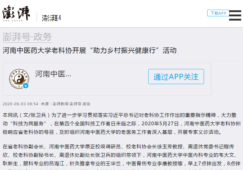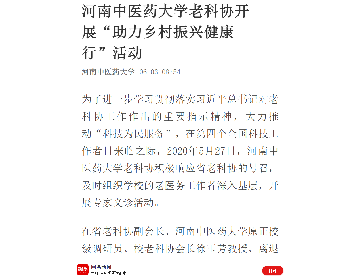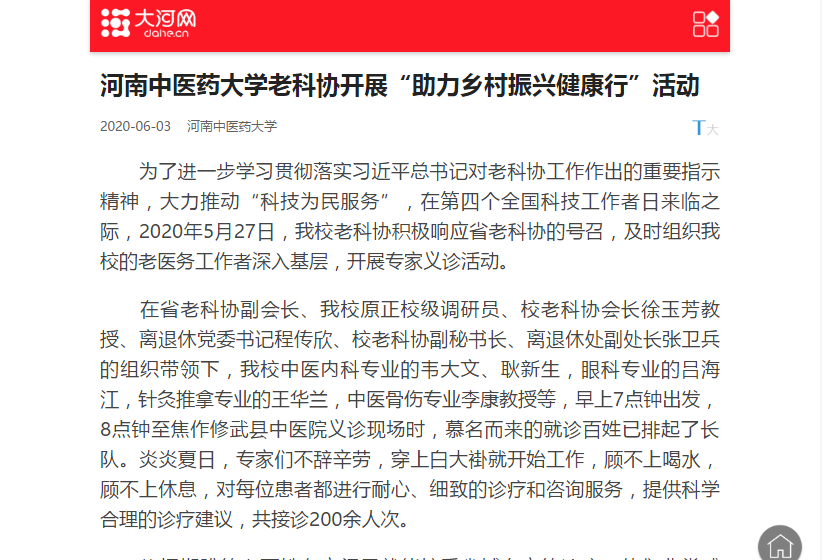 2020年6月3日,大河网、网易新闻、澎湃新闻等媒体对我校老科协开展“助力乡村振兴健康行”活动进行报道。