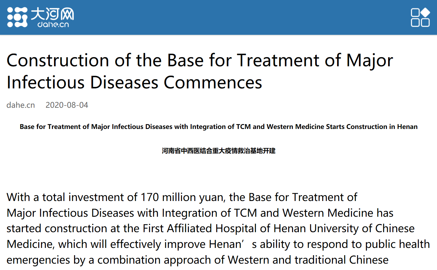 编者按:2020年8月4日,大河网对河南省中西医结合重大疫情救治基地正式落户我校一附院进行双语报道。现将全文刊发如下: