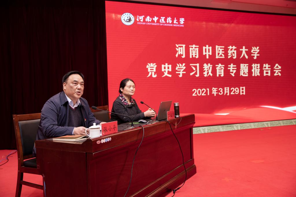 本网讯(文/李冕 图/秦东仁)2021年3月29日,我校党史学习教育专题报告会在图书馆第一报告厅顺利举办,武汉大学党的建设专业和马克思主义中国化研究专业博士生导师、国家万人计划教学名师丁俊萍教授应邀来我校作《党的历史发展与使命担当》专题报告。校领导别荣海、张小平、李小芳、李建生、王少玉、徐江雁、田力、苗明三、司富春出席报告会。校党史学习教育领导小组成员和领导小组办公室相关部门负责人、基层党组织书记、教师党支部书记、学生党支部书记及师生党员代表参加报告会。报告会由校党委副书记、工会主席张小平主持。