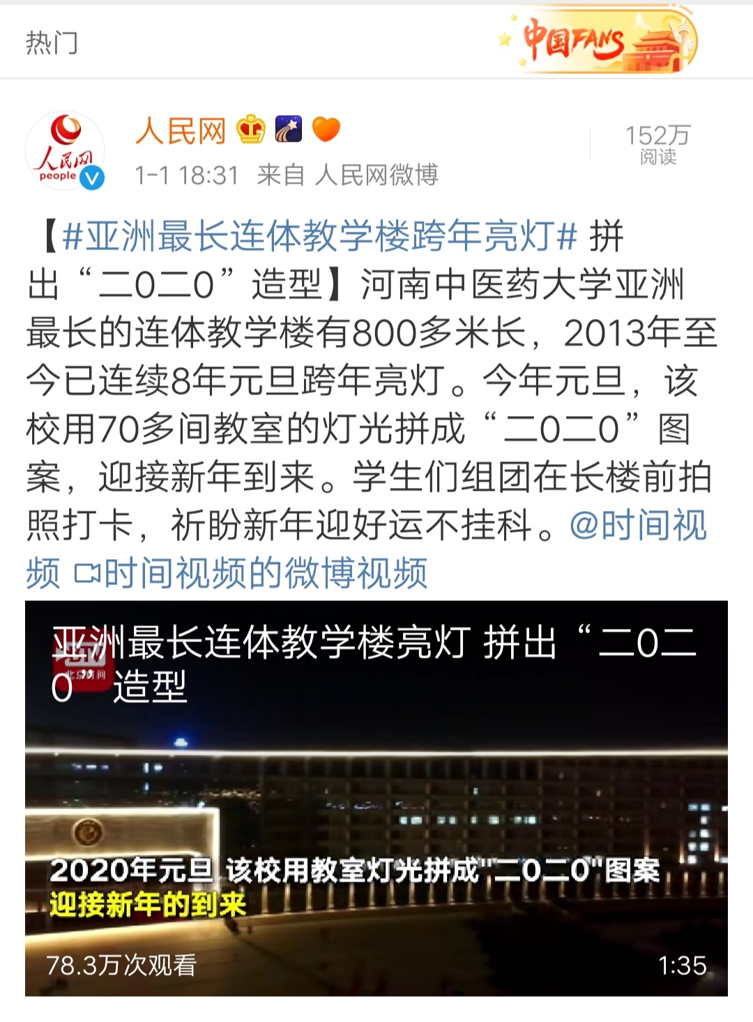 2020年1月1日,人民网官方微博对我校教学实验大楼跨年亮灯“二〇二〇”进行报道。