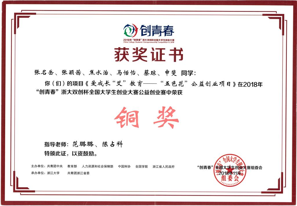近日,由共青团中央、中国科协、教育部、中国社科院、全国学联和浙江省人民政府共同主办的第十一届“创青春”全国大学生创业大赛终审决赛在浙江大学落下帷幕。我校第一临床医学院“爱成长‘艾’教育——‘五色花’公益创业项目”获得国家级三等奖。