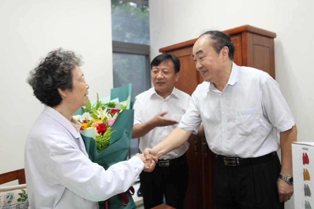 2018年8月19日上午,在首届“中国医师节”当日,河南省教科文卫体工会主席符明轩在我校一附院党委书记翟剑波、副院长蒋士卿的陪同下,亲切慰问了在国医堂坐诊的老专家,送上了节日的祝福。