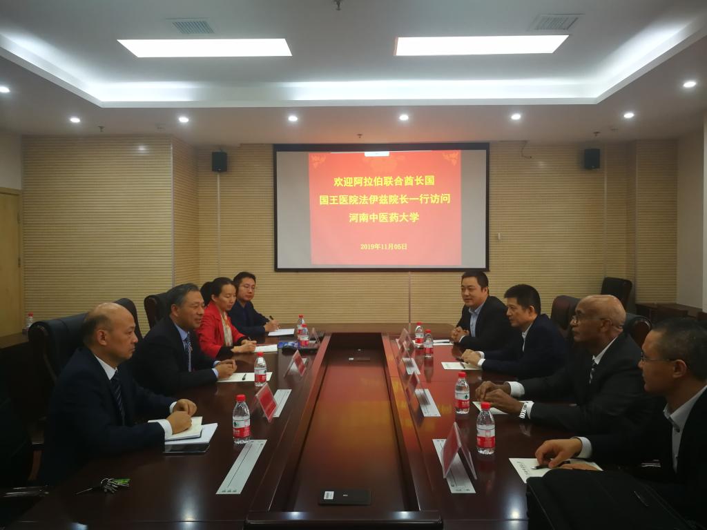 本网讯(文图/赵俊卿)2019年11月5日,阿拉伯联合酋长国国王医院法伊兹院长与广东一方制药有限公司副总经理张军等人一行前来我校进行访问,校党委委员、副校长徐江雁会见来宾,相关部门负责人参加会谈。