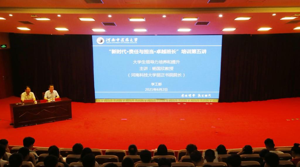 本网讯(文/图 付珍娜)2021年6月2日晚,由我校学工部主办的2021年“新时代·责任与担当·卓越班长”培训班第五讲在图书馆第一报告厅举行。河南科技大学杨国欣教授受邀前来我校,以《大学生领导力培养和提升》为题,为龙子湖校区全体班长,管理学院、信息技术学院、外语学院全体团支书及学生会干部进行培训。培训由学生工作部副部长李志轩主持。
