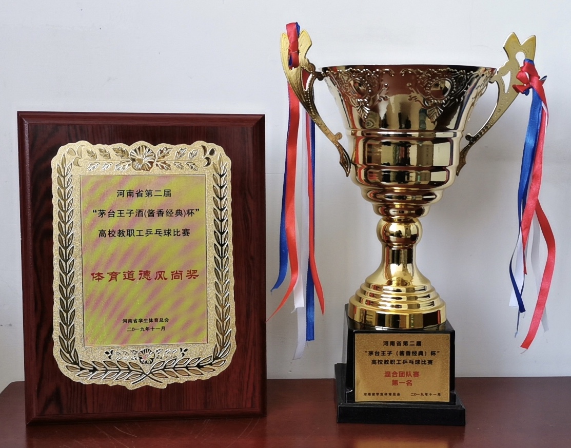 本网讯(文图/常瑞)为进一步贯彻落实国务院《全民健身计划》的战略要求,2019年11月23日-24日,由河南省学生体育总会主办、河南工业大学承办的河南省第二届高校教职工乒乓球比赛在河南工业大学新校区举行,来自全省40所高校的近400名教职工参加了比赛。经过两天、两个阶段的激烈角逐,我校代表队荣获团体第一名,并获“体育道德风尚奖”,中共河南省教育厅党组书记、教育厅厅长郑邦山为我校颁奖。