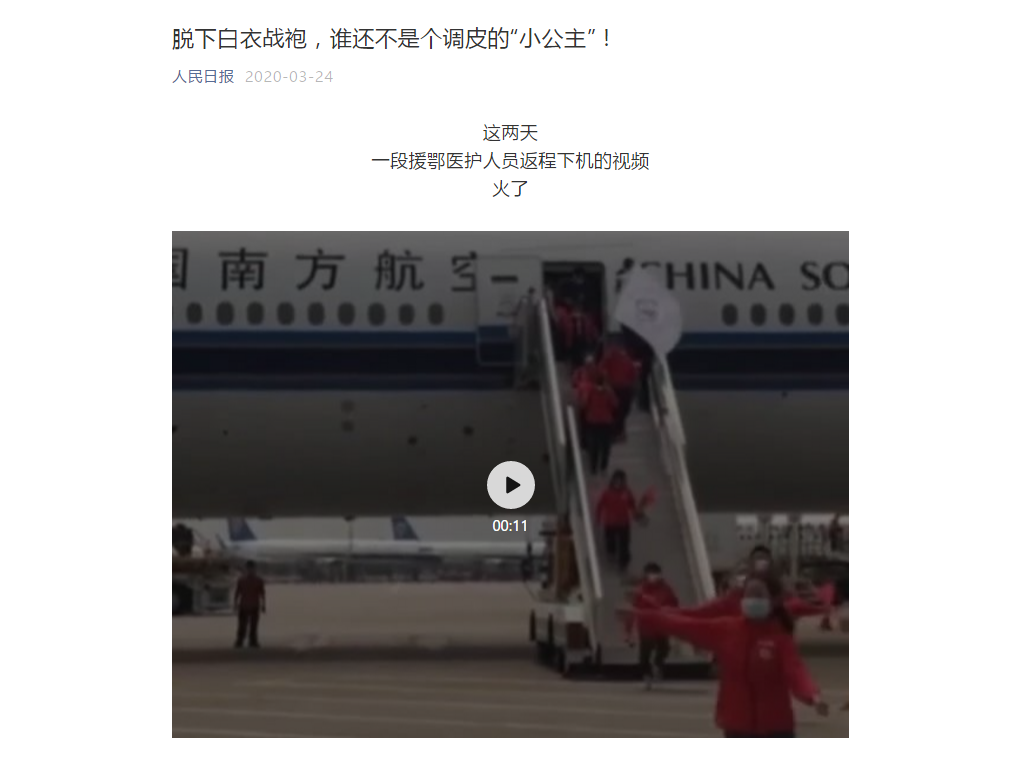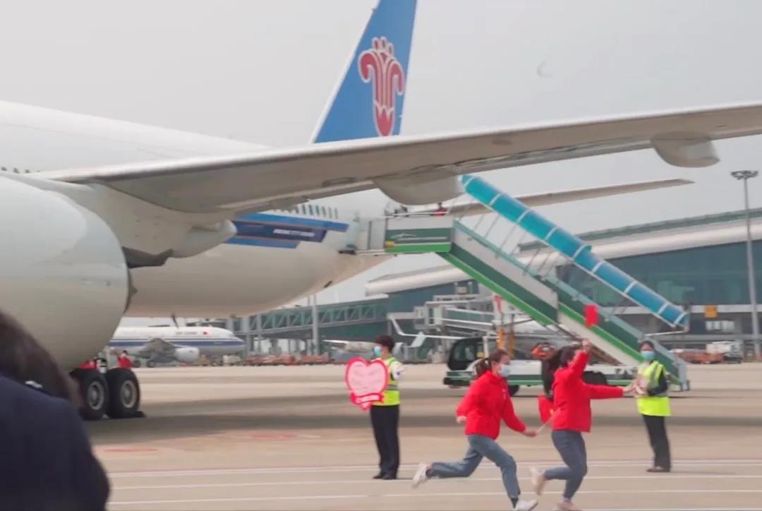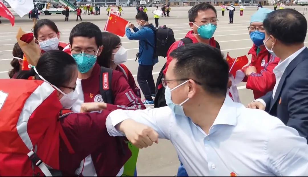一段援鄂医护人员返程下机的视频