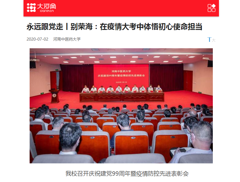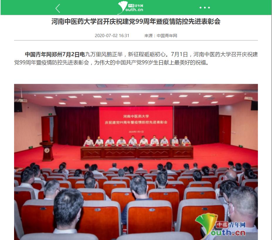 2020年7月2日,中青网、大河网对我校召开庆祝建党99周年暨疫情防控先进表彰会进行报道。