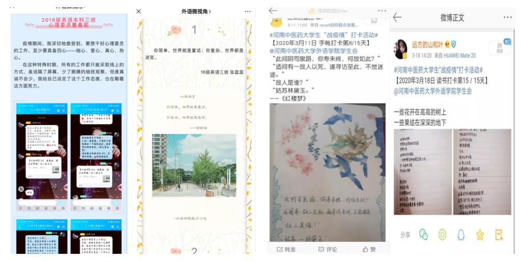 外语学院充分利用新媒体平台,创新性开展学生心理健康教育工作。疫情期间,外语学院在学院公众号外语微视角开设“心理小贴士”、“心语微言”特色板块,定期给同学们推送心理知识与疏导方法,开设“心委time”板块,宣传各班心理委员在疫情期间的的工作经验和方法,促进心理委员工作经验交流。为培养同学们的自我管理能力,丰富宅家活动,开展了“战疫情”打卡活动和“时不我待,书香永存”七天读书打卡分享活动,通过假期学习、生活习惯、日常兴趣三个方面的微博打卡,展现外语学院学子乐观的生活态度和积极向上的精神风貌。为激发同学们的家国情怀和人文关怀,举办了“以笔战疫”主题征文活动,通过向奋斗在疫情一线的英雄们致敬,让同学们做生活中的“有心人”。此外,把疫情危机化为教育契机,开展了“吐槽大会——我和家人的那些事儿”心理主题班会,鼓励同学们正确看待与家人之间的冲突,学会换位思考,构建和谐家庭氛围。