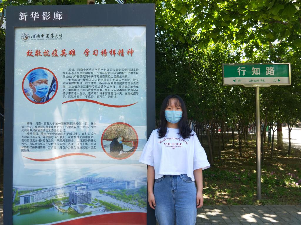 张六合:浓浓的学校氛围。严冬时放假回家,归来时已是初夏。阔别已久的河中医校园里,有郁郁葱葱的树木、独自傲然的月季和波光粼粼的天一湖。安静,这是校园里少有的安静。偌大的校园回荡着鸟儿的歌唱、草坪上喷水器滴滴答答的声音以及风儿无声的喧嚣,唯独少了校园里热闹的人声。曾经放学时分,从大长楼到餐厅的路上总是人头攒动,熙熙攘攘,热闹的人声洋溢着青春的活力,朝气蓬勃地向天空呼喊。阳光总在风雨之后,短暂的阴霾后的光芒更为耀眼。河中医有一种力量,一种历久弥新、顽强不息的力量,一种坚韧的、温暖人心的、熠熠生辉的光芒。校园的变化不止于此,随着脚步的深入,细小的变化逐渐积累,随处可见的标语、进行校园引导的老师、响彻校园的安全广播……在我们看不到的地方总有人在为我们默默付出。如今,回到校园的我们正在积极调整身心,让自己尽快投入学习生活,与全校师生共同努力早日迎来抗击疫情的全面胜利。