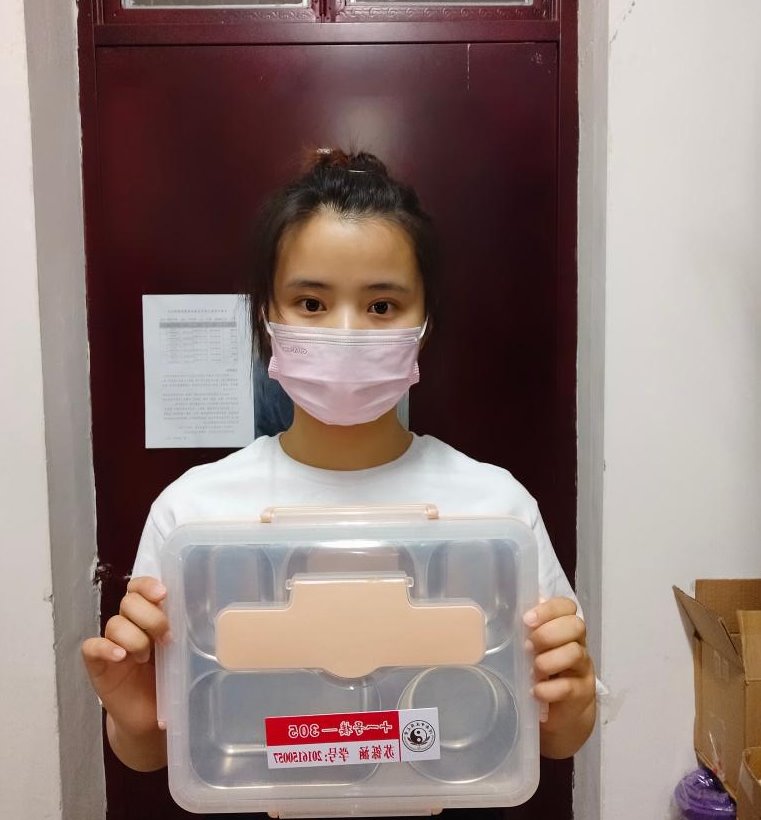苏铄涵:特别的餐盒饭菜。刚进入宿舍,便在书桌上发现我们即将使用的餐盒和配套的洗手液、洗洁精,不由喜出望外。每套餐盒上都有一个标签,标签上不仅彩印了学校的校徽,还标注了属于我们的个人信息——居住楼号、宿舍号以及每个人的姓名、学号;迫不及待地打开餐盒,里面是配套的餐具筷子和勺子;打开盖子,里面是三菜一汤的设计,下部的不锈钢餐盘与粉色托盘是可以拆卸的,里面可以加热水以方便同学们加热饭菜,也更加方便我们清洗。女生的饭盒整体设计是粉色与透明相间,男生则是天蓝色与磨砂透明相间,这一个个微小的细节,让我感觉到学校的用心与细致,深切感受到学校带给我们的体贴与关怀。通过返校复学这几天对餐盒的使用更是让我觉得便利。餐盒封闭性很好,学校准备的饭菜也很丰盛且合胃口,每周都会提前给出下一周的菜单,每天的饭菜也都精细搭配、营养均衡,真的很感谢餐厅师傅和返校复学中辛苦工作的每位老师,让我们在这个夏日收获了一份爱的美好。