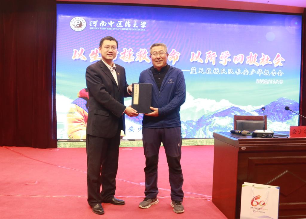 活动现场,校团委书记高磊代表学校与安少华互赠礼品留做纪念。报告会结束后,安少华一行参观了我校中药馆、医史馆、生命科学馆。
