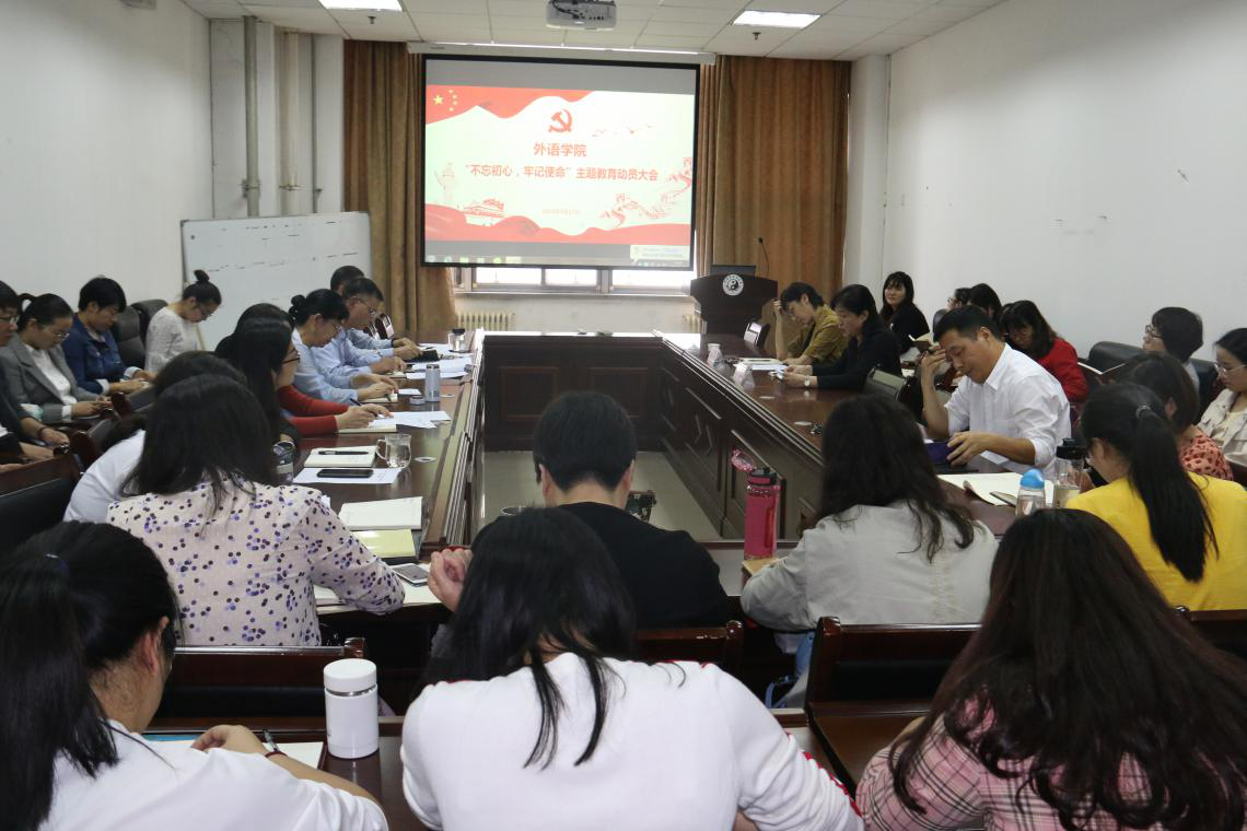 2019年9月17日下午,外语学院在A638召开“不忘初心、牢记使命”主题教育动员会议。学校主题教育第一指导组成员马瑜、李琳到会指导。外语学院领导班子成员、全体教师党员及学生党员代表等参加了会议。会议由外语学院党委副书记苏峰主持。