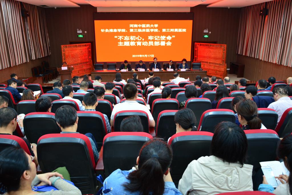 2019年9月17日下午,三附院在学术活动中心二楼召开了“不忘初心、牢记使命”主题教育动员部署会议。学校主题教育第三指导组组长刘保庆到会指导并讲话。三附院党委书记周运峰作动员部署讲话。院长张大伟主持会议。学校主题教育第三指导组成员、学校党委组织部副部长马赟以及学校主题教育第三指导组成员张慧俭、孟复等到会指导。三附院在郑领导班子成员、全体党(总)支部书记、中层干部及先进党员代表等参加了会议。