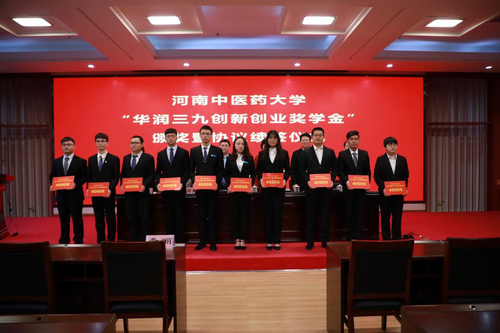本网讯(文/夏静林 图/张金霄)2019年3月22日下午,我校2017-2018学年“华润三九创新创业奖学金”颁奖暨协议续签大会在图书馆第二报告厅举行。华润三九医药股份有限公司配方颗粒事业部战略业务总监、华中分公司总经理王俊浩、河南区域总经理万曙光、招聘高级经理田霜和校党委委员、副校长田力,学生处、学生资助管理中心相关负责人、各学院资助专员及20名获奖学生及团队代表参加会议,会议由心理健康教育与咨询中心、学生处副处长李俊芝主持。