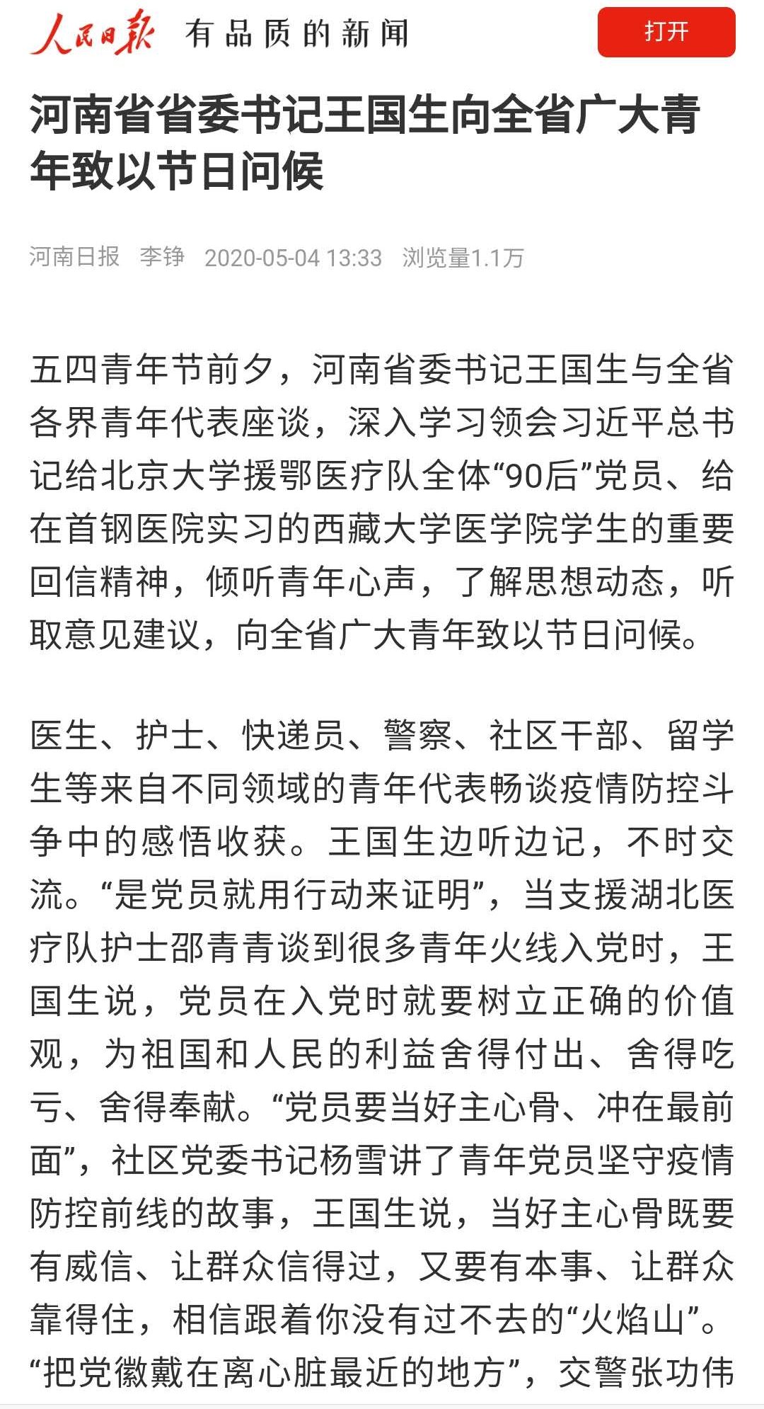 五四青年节前夕,河南省委书记王国生与全省各界青年代表座谈,深入学习领会习近平总书记给北京大学援鄂医疗队全体“90后”党员、给在首钢医院实习的西藏大学医学院学生的重要回信精神,倾听青年心声,了解思想动态,听取意见建议,向全省广大青年致以节日问候。