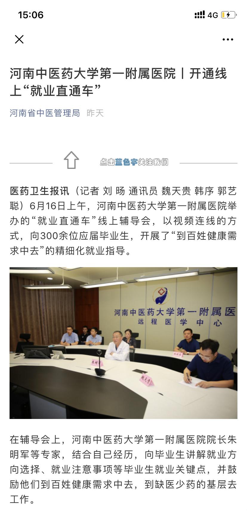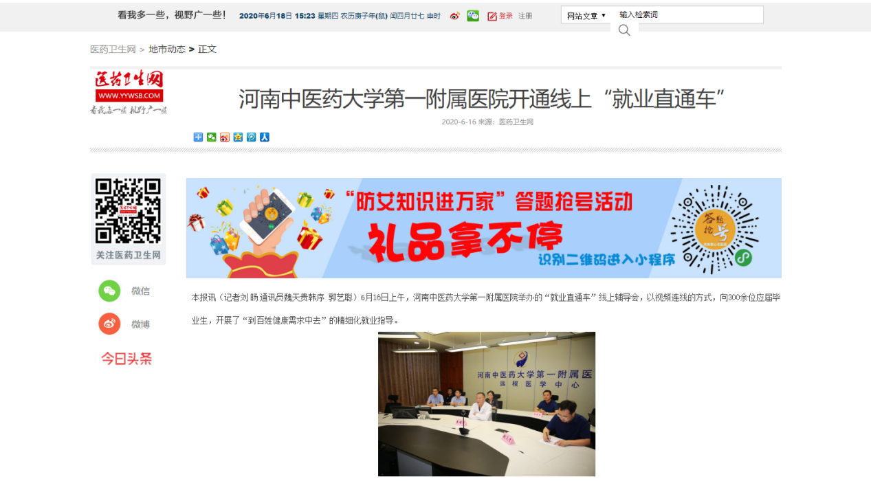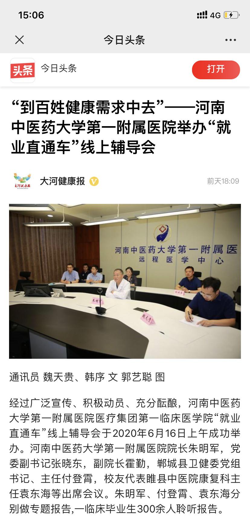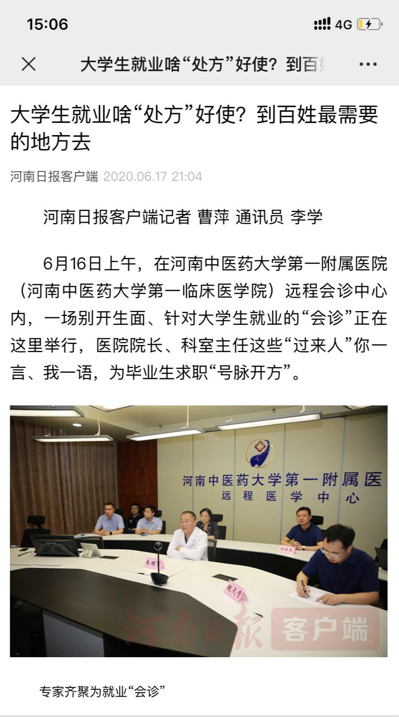编者按:近日河南日报、河南日报客户端、河南省中医管理局公众号、医药卫生网、大河健康报等媒体对我校一附院召开“到百姓和国家最需要的地方去”就业指导直通车线上辅导会进行了报道,现将部分媒体报道发布如下。