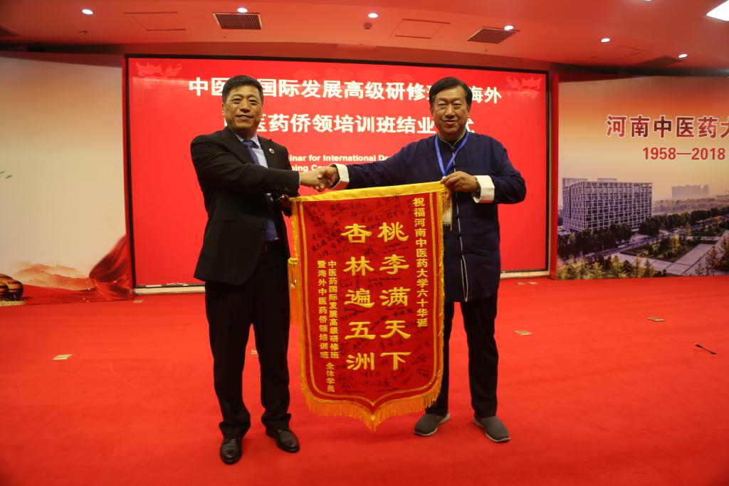 典礼上,许二平对学员们遵守培训纪律、孜孜以求的学习态度表示赞赏。他说,此次培训班为期10天,课程安排着重突出我校仲景学术特色,并结合海外中医人士从事临床的实际需要,邀请了囯医大师、名老中医、学术造诣深厚的教师担任主讲,受到了学员们的欢迎和高度评价。他对学员们积极参加建校60周年系列学术活动,为学校建设发展提出的宝贵意见表示感谢。他强调,培训班的举办,对学校今后举办国际性学术会议具有很好的借鉴作用。他指出,随着“一带一路”的持续推进,通过大家的共同努力,仲景文化一定会更广泛地在世界传播。参加培训的学员纷纷畅谈了学习的收获和感想,并一致表示,非常感谢学校的精心组织和热情、周到、贴心的服务。学员们还共同签名向学校赠送了“桃李满天下,杏林遍五洲”的锦旗。