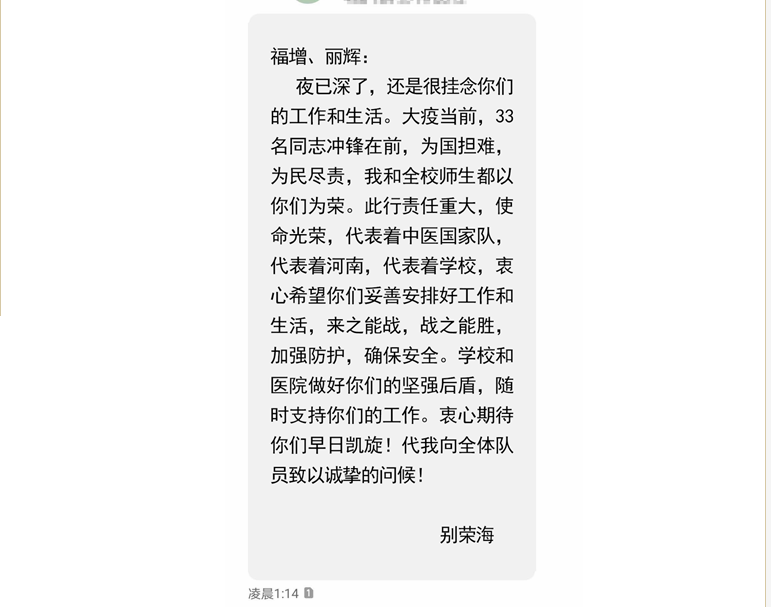 夜已深了,还是很挂念你们的工作和生活。大疫当前,33名同志冲锋在前,为国担难,为民尽责,我和全校师生都以你们为荣。此行责任重大,使命光荣,代表着中医国家队,代表着河南,代表着学校,衷心希望你们妥善安排好工作和生活,来之能战,战之能胜,加强防护,确保安全。学校和医院做好你们的坚强后盾,随时支持你们的工作。衷心期待你们早日凯旋!代我向全体队员致以诚挚的问候!