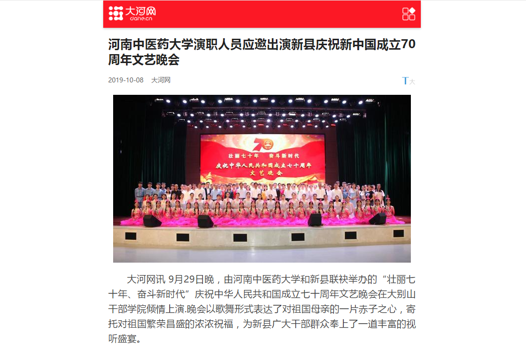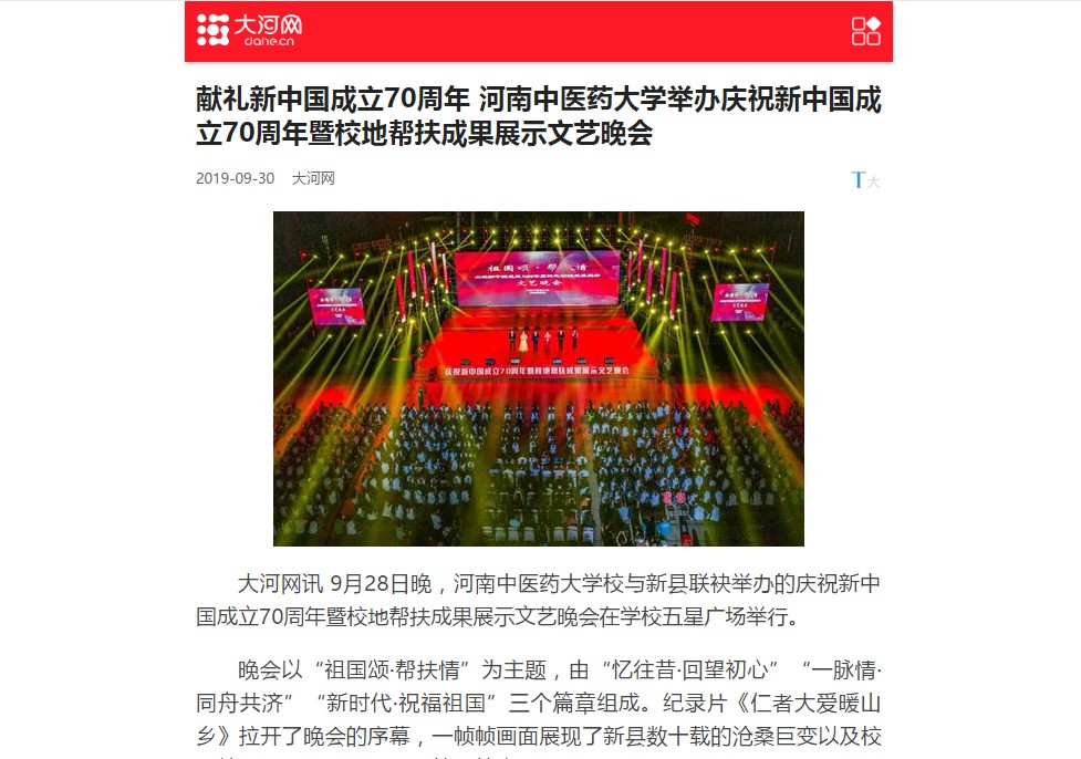 编者按:2019年10月8日,大河网对我校举办庆祝新中国成立70周年暨校地帮扶成果展示文艺晚会进行报道。