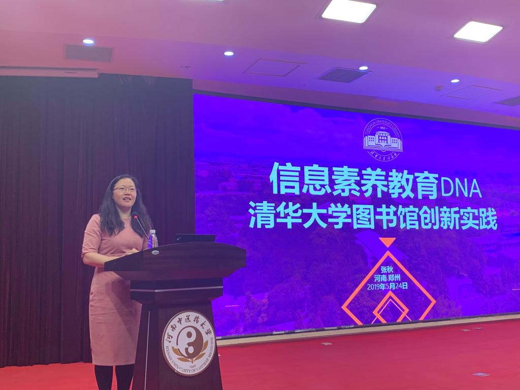 会上,崔波在致辞中介绍了图书馆文化、阅读推广、信息素养教育等方面内容,并结合本次会议主题,详细阐述了信息素养教育在当今社会的重要意义。张秋作了题为《信息素养教育DNA——清华大学图书馆创新实践》的主题报告,她结合清华大学图书馆的建设发展情况,与大家分享了信息素养教育要做到的四大要素,即顺应教育环境的变化,更注重技术;符合信息素养的规律,更加规范;跟随学校发展的步伐,更加国际;满足人才培养的需求,更加创新。她还提出了构建信息素养教育的“全员大队伍、全方位大平台、全过程大机制”三全模式。