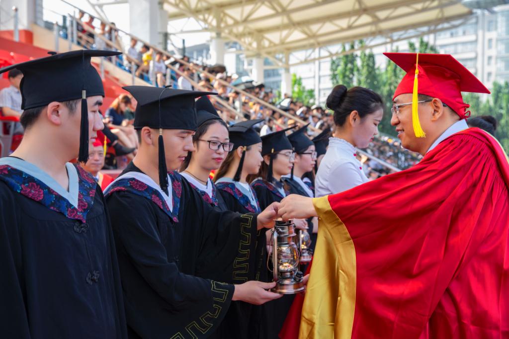 校党委书记别荣海代表学校,向优秀毕业生代表赠送具有特殊意义的纪念品——一盏闪着明亮灯光的马灯。古代中医弟子学成出师之时,老师要向学生赠予一盏马灯,提醒学子行医之路要风雨无阻,不分昼夜。这份珍贵的礼物还蕴含着母校对毕业生们“牢记使命,传承创新中医国粹”的深切希冀,这份珍贵的礼物为即将离开母校的同学们点亮了理想之灯,照亮了前行之路。