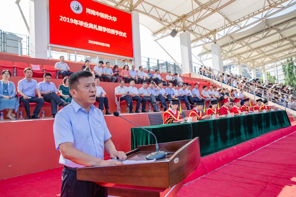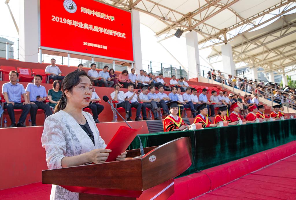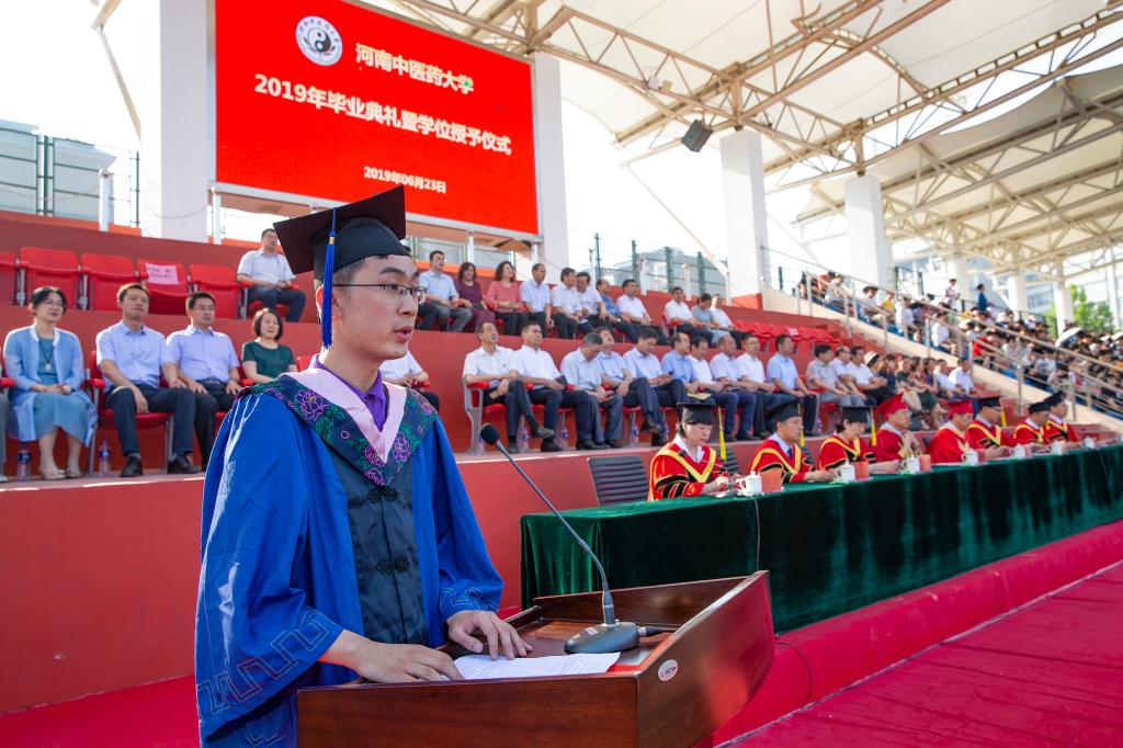 7点30分,仪式正式开始,全体人员起立,奏唱《中华人民共和国国歌》。副校长冯卫生介绍了2019届毕业生毕业情况并宣读了学位委员会学位授予决定,校党委委员、工会主席张加民宣读了《河南省教育厅关于表彰2019年河南省优秀毕业生的决定》,我校张蓝熙等91名毕业生获“河南省优秀应届大中专毕业生”称号。校领导共同为优秀毕业生代表颁发荣誉证书、毕业证书、学位证书,并扶正流苏。