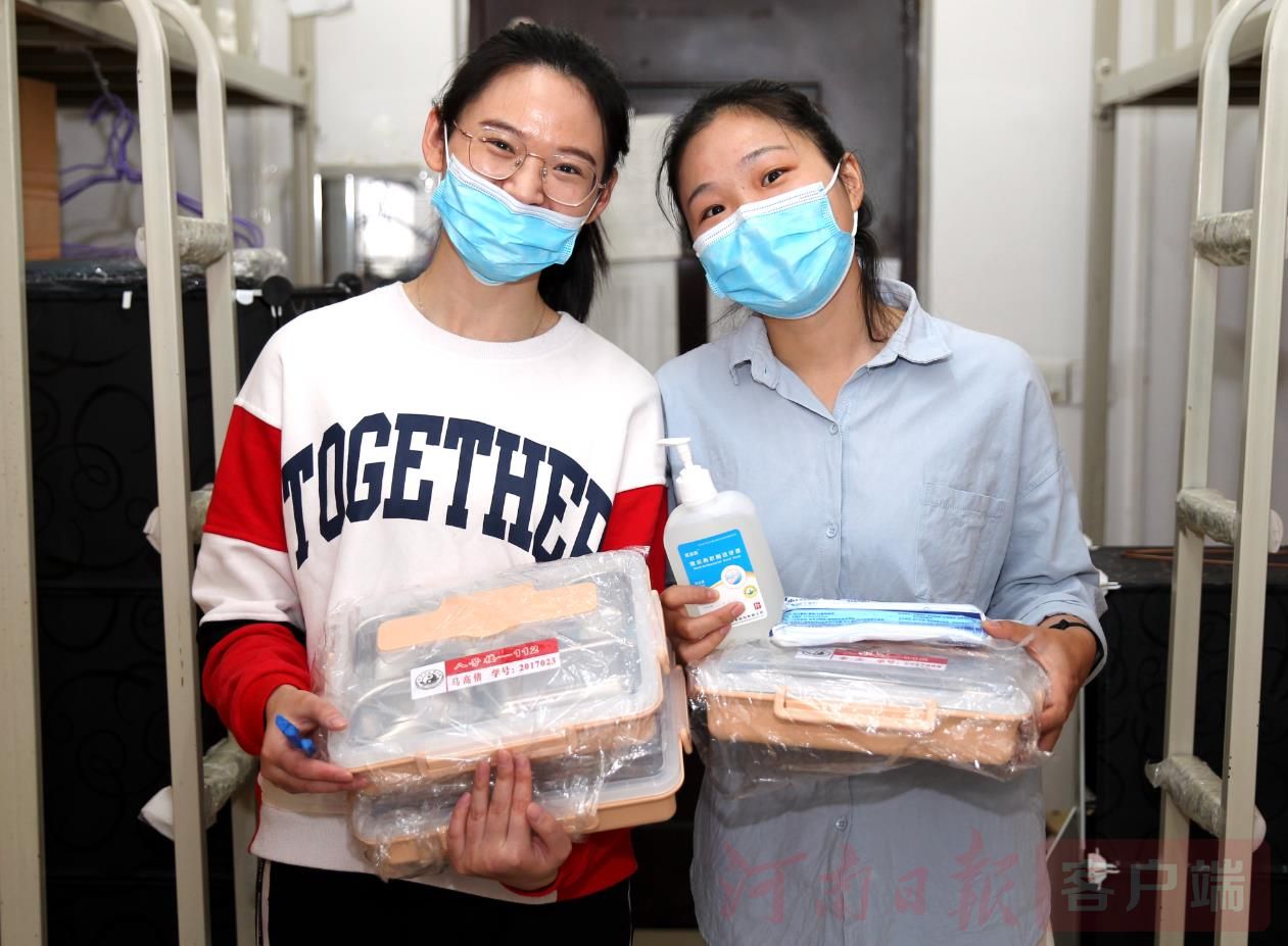 同学们拿到学校免费发放的饭盒、防疫用品非常开心