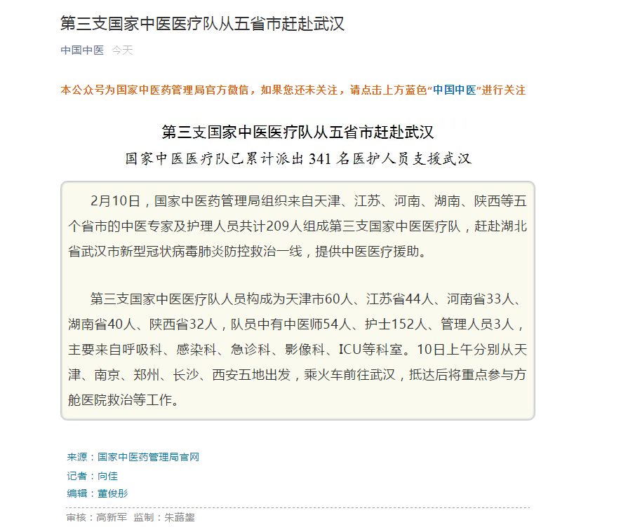 编者按:2020年2月10日,国家中医药管理局官方微信对我校援助武汉国家(河南)中医医疗队启程进行报道。现将全文刊发如下: