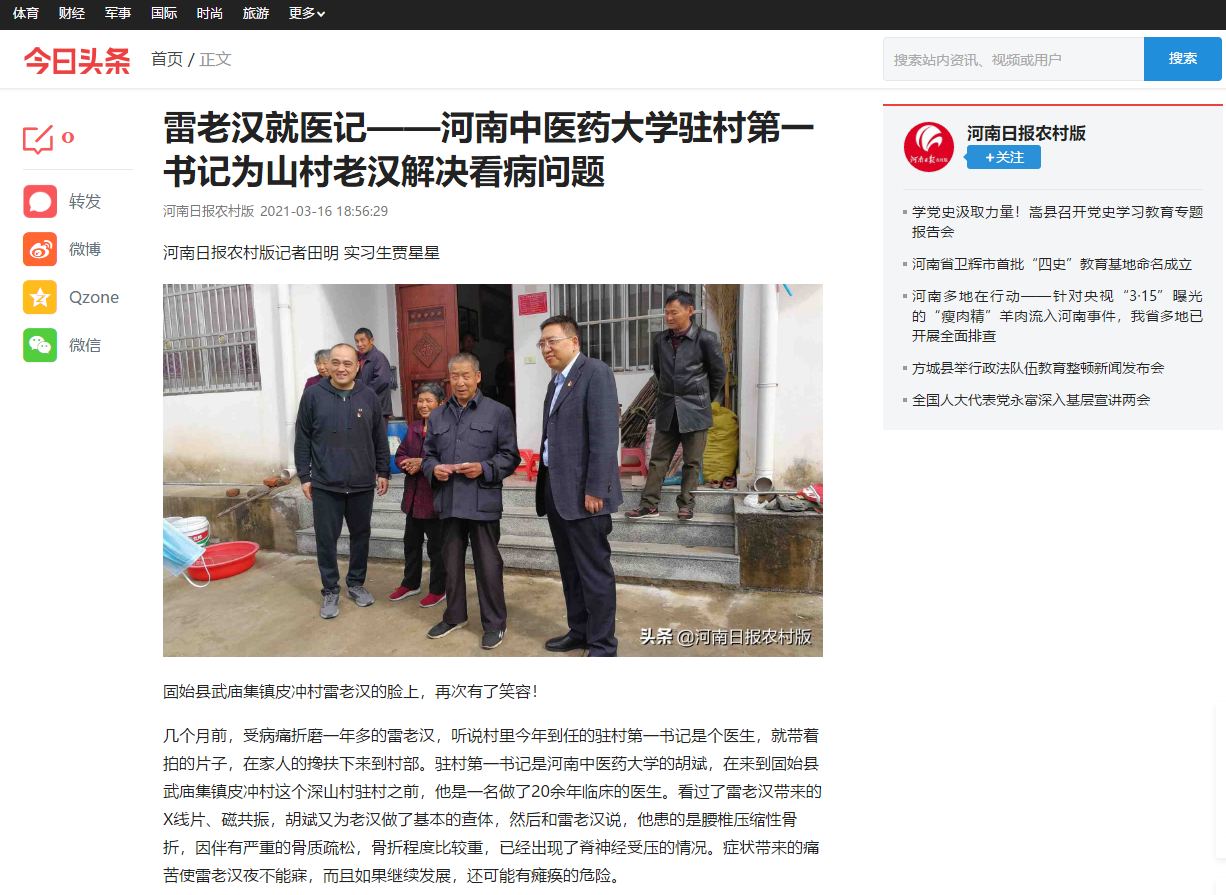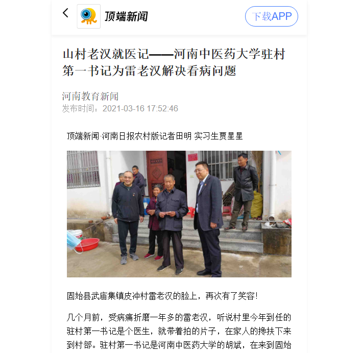 编者按:2021年3月16日,顶端新闻、今日头条对我校驻村第一书记胡斌为山村老汉解决看病问题的感人事迹和我校发挥特色优势助力脱贫攻坚、持续做好健康扶贫等进行报道。现将顶端新闻全文刊发如下: