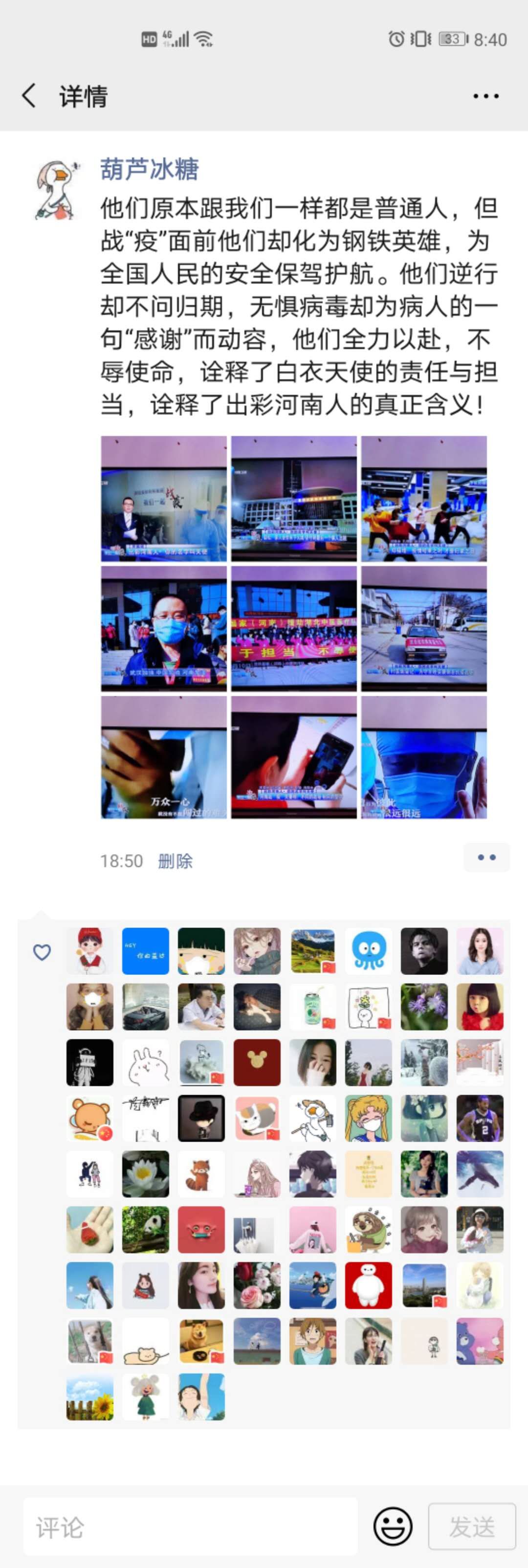 节目播出后,医院的同事们被郑福增副院长朴实无华的语言、坚定的抗疫决心深深感动,他们既表达了对郑福增副院长等前线抗疫英雄的敬佩,又决心坚守岗位、做好本职工作。“七叶一枝花”说:“舍小家,为大家,舍亲情,因为责任和使命。万众一心,就没有不能闯过的难关!这样的责任和使命,帮祖国和人民共渡难关!战胜疫情,我们等你们回家!!!”“京味儿炸酱”说:“举国抗疫,勇士们披挂上阵,逆风而行哪有什么岁月静好,只是有那么一群人敢上去玩命,只期待春暖花开时,你们健康归来!”“葫芦冰糖”说:“他们原本跟我们一样都是普通人,但战‘疫’面前他们却化为钢铁英雄,为全国人民的安全保驾护航。他们逆行却不问归期,他们全力以赴,不辱使命,诠释了白衣天使的责任与担当,诠释了出彩河南人的真正含义!”宋亚琳说:“身着白衣,心有锦缎,你们是最美的逆行者,也是这个时代最可爱的人。”李飒威说:“从来没有天使,只不过是我们穿上了这身白色的衣服,我们戴上了鲜艳的党徽,我们就肩负起了保卫人民健康的责任,肩负起了为人民服务的立党宗旨。没有国就没有家,我们不会辜负这一身白衣,更不会辜负这个国家的培养。我们肯定会赢!武汉肯定会嬴!我们共产党肯定会赢!中国肯定会赢!”