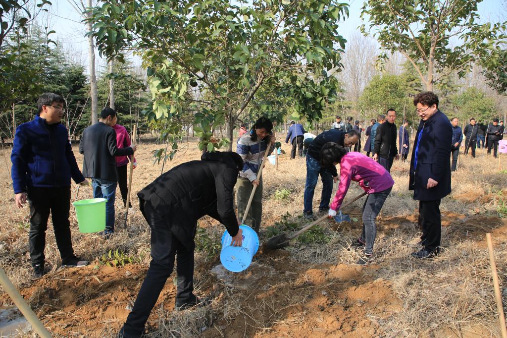 在植树现场,校领导和干部职工热情高涨,相互协作,默契配合,有的扶植树苗,有的铲土填坑,有的脚踩夯实,有的挥锹培土,有的提水浇灌,每道工序都做得有条不紊,十分认真,高质量完成了50余株树苗的栽种任务。