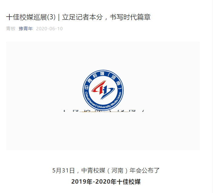 编者按:2020年6月10日,中青校媒(河南)信息发布平台对我校新媒体(校报)记者团荣获省十佳校媒进行报道。现将全文刊发如下:
