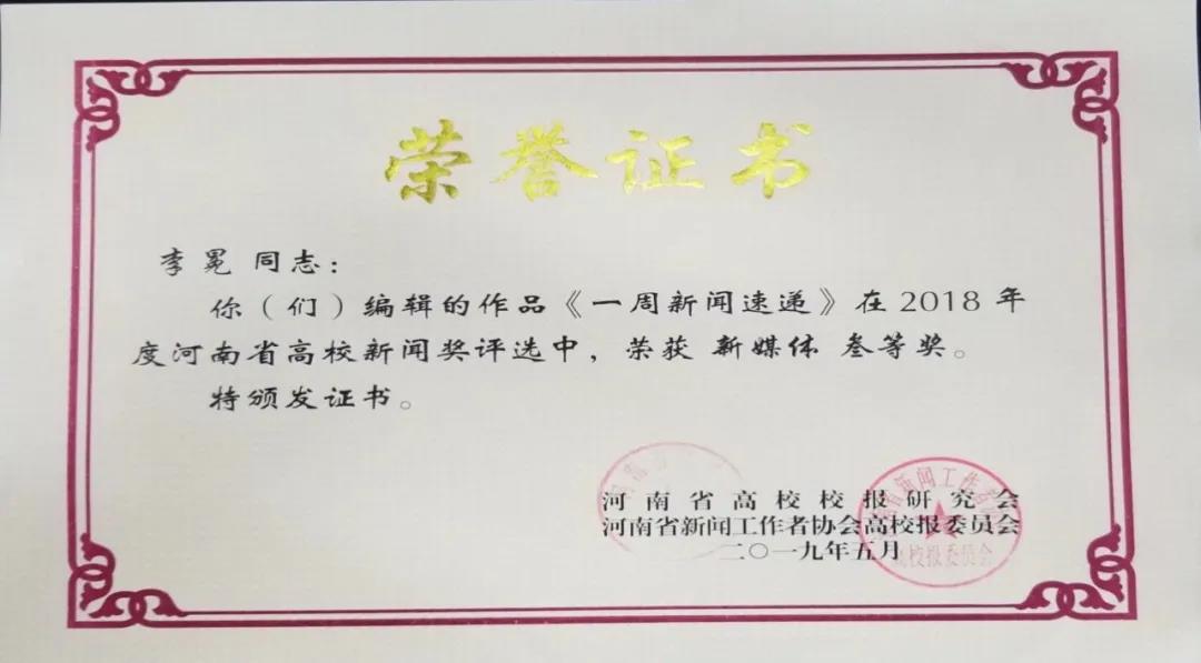 视频部获2018年度河南省高校好新闻奖新媒体作品类三等奖。