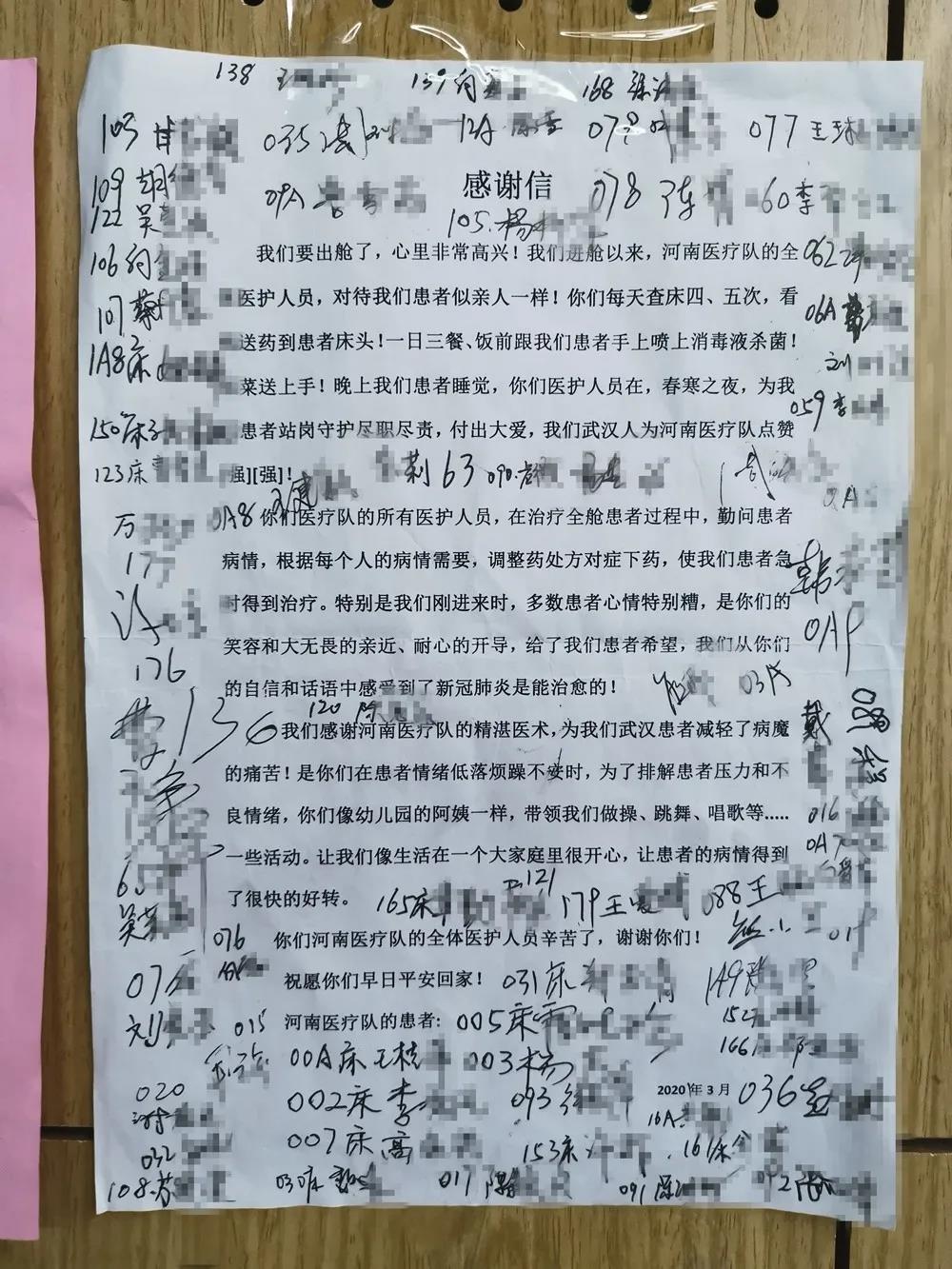 患者们被医护人员无微不至的照顾和专业精心的治疗深深感动,70名患者亲笔签名,为二附院医护人员送上了一封质朴的感谢信。一封信承载了无限感激之情,大家在现场动情朗诵。没有锦旗,全体患者向医护人员深深鞠躬,异口同声:“感谢您们,您们辛苦了,武汉人民忘不了您们。”医护人员回应“祝你们早日康复”“武汉加油,湖北加油,中国加油”。动人的声音响彻病区,全场顿时沸腾起来。