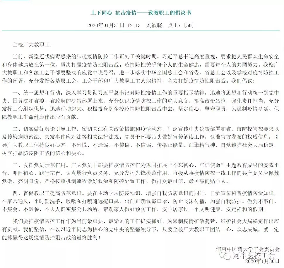 编者按:生命重于泰山,疫情就是命令,防控就是责任。疫情面前,学校党委按照习近平总书记的重要指示,中央、省委决策部署和上级有关要求,站在讲政治的高度,坚持把疫情防控工作作为学校当前最重要的工作,团结带领全校党员干部和教职工生,坚守初心、牢记使命,高度重视、迅速行动,以实际行动为国担难、为民尽责,让党旗始终在疫情防控一线高高飘扬,展示了新时代河中医人的使命和担当。我们在学校中文网、新闻网、官方微信、官方微博等融媒体平台推出系列报道【党旗飘扬】防控疫情,河中医在行动,现推出第十期(校工会专题)。